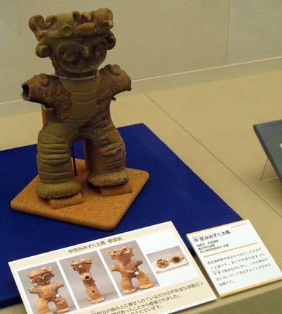 | みみずく土偶でも中空になっているので自立できる、と説明プレートにあった。だが、樹脂で強化するなど修復されたせいか、展示室ではポールに支えられていた。 そして、桶川市歴史民俗資料館の中空みみずく土偶(後谷遺跡)と比べてどうだろう、足が長いかな。さきたま史跡の博物館の企画展で見学。 |
